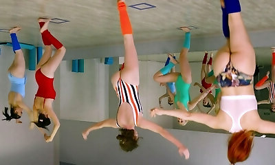 Four girls are exercising in the living bedroom and when they get sweat-soaked the lesbian masturbation starts